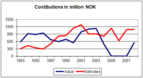 The chart below shows simplified estimates of what banks' total contribution payments would have been since 1993 at these rates. The chart also shows actual contributions to the commercial banks' and savings banks' guarantee funds up until 2002 and for the merged Banks' Guarantee Fund as from 2003. The estimates assume ordinary contributions calculated on the basis of the previous year's balance sheet and that full contributions are paid until the sum total of estimated pay-ins since 1993 is at least as high as actual pay-ins have been. Since then, i.e. as from 2006, half of the contribution amount is assumed.
