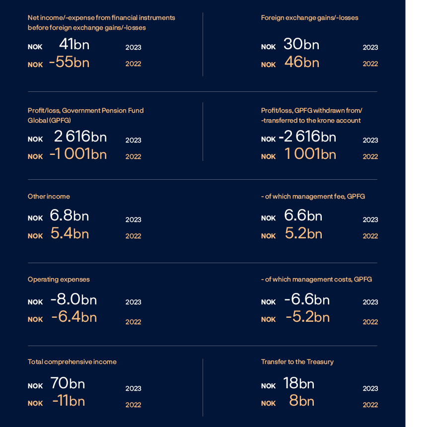 - In accordance with the guidelines, the net profit of NOK 70.0 billion is to be transferred as follows: NOK 33.4 billion to the Adjustment Fund and NOK 36.6 billion to the Transfer Fund. From the Transfer Fund, one-third, or NOK 17.6 billion, will be transferred to the Treasury.