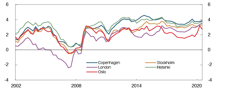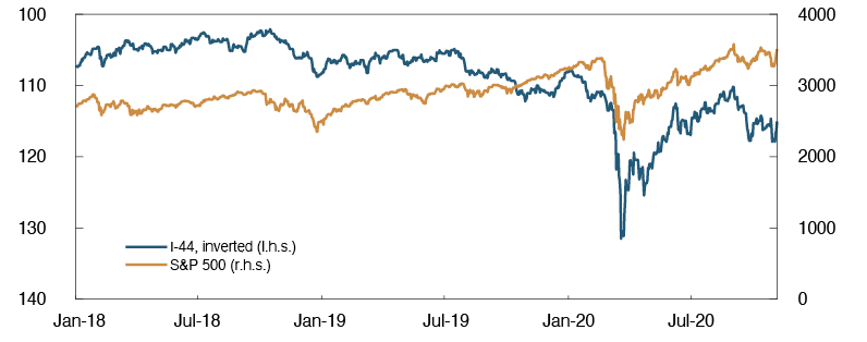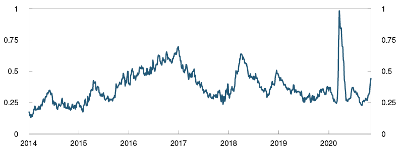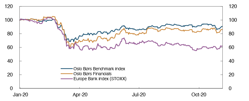 In summer and early autumn, the uncertainty in global financial markets abated and oil prices rose. At the same time, the krone appreciated, equity indexes advanced and money and bond market premiums fell. Recently, there has been renewed turbulence in global and domestic financial markets at the same time as a significant increase in infection rates and new containment measures, which impede economic activity.
