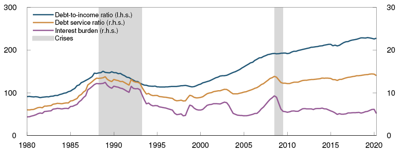 After a long period when household debt grew faster than household income, debt growth has slowed in recent years and has been more in line with income growth. Reduced debt growth reflects the interest rate increases in 2018 and 2019 and measures by the authorities to limit borrowing (see"Regulation of financial institutions’ credit standards"). After the Covid-19 outbreak, household debt growth has continued to be moderate. Household leverage (debt-to income ratios) remains high, both historically and compared with other countries, but is at about the same level as in 2019 (Chart 1.5). Household leverage will continue to increase somewhat ahead as low interest rates stimulate borrowing, while the Covid-19 pandemic contributes to weaker income growth.
