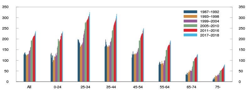 Tax return data from 2018 show that average household debt continued to rise in all age groups, but growth was restrained somewhat compared with the previous year. There was still a rise in leverage (Chart 1.6). Preliminary tax return data for 2019 indicate a more moderate rise in leverage in most age groups and a weak decline among younger age groups.8