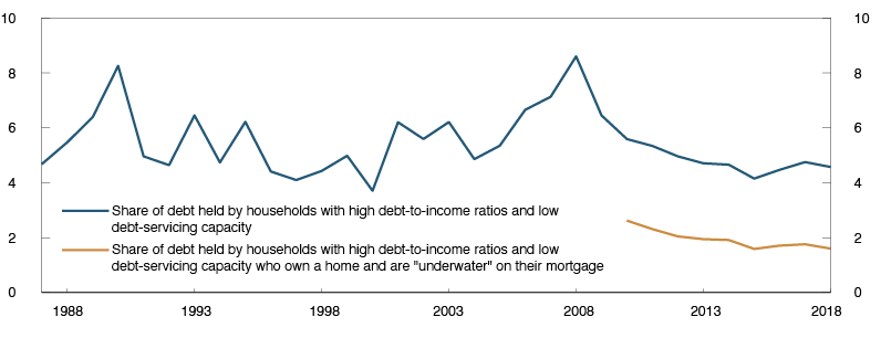 Tax return data show that the share of highly leveraged houseolds (debt over five times gross income) and households with low debt servicing capacity (annual margin below one month’s income) has stabilised in recent years. The share of households “underwater” (net bank debt higher than their dwelling’s market value) is also stable. Households with both high debt and low debt servicing capacity that at the same time are also underwater (if they are homeowners) have less flexibility in the event of negative shocks. The debt held by these households is assumed to be particularly vulnerable. This debt represents a small share of household debt. This share fell back somewhat in 2018 after rising the two previous years (Chart 1.7). The residential mortgage regulation has contributed to limiting new lending to vulnerable households,10 thereby reducing the build-up of housing sector vulnerabilities.