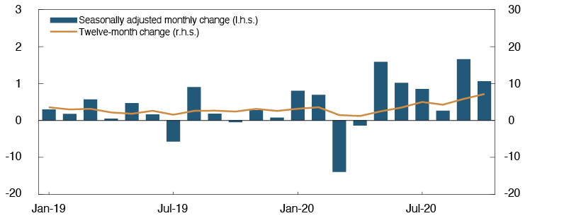 The Covid-19 pandemic and the introduction of measures to contain it led immediately to lower turnover for many businesses, a substantial rise in unemployed and a fall in property prices. The consequence is reduced incomes, which weaken borrowers’ debt servicing capacity. Lower property prices reduce the value of banks’ collateral. Subsequently, activity in the Norwegian economy has picked up. House prices have also risen markedly through summer and autumn and are higher than prior to the pandemic. Recently, commercial property prices have risen as well.