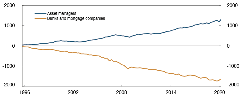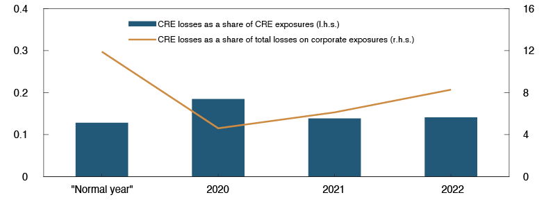 Historically, selling prices for commercial real estate have risen substantially in advance of financial crises. Commercial property prices have risen for a long time and are at high levels. Selling prices for office space in Oslo fell in the first half of 2020, primarily owing to lower rents. Recently, however, the fall in selling prices has reversed, primarily driven by lower yields. Structural changes, such as increased use of remote working and online shopping, may affect developments in commercial property prices in the longer term. The Covid-19 pandemic may reinforce this trend. A substantial price fall may inflict large losses on banks. In recent years, banks have tightened lending conditions for commercial real estate, which limits the risk of losses.