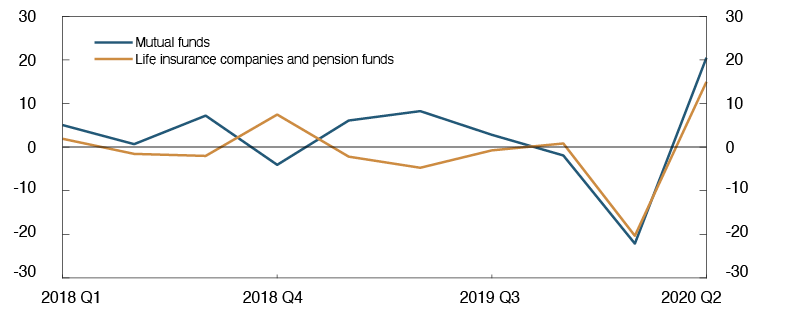 The financial market turmoil affected both banks and other market participants. Risk premiums on banks’ wholesale funding rose markedly and access to funding was reduced. Large corporates that obtain financing directly in the bond market were also affected. The krone exchange rate, measured by the import-weighted exchange rate index I-44, reached record weak levels in March. Substantial volatility in market prices led to increased margin calls on derivatives contracts in a number of countries. The sharp krone depreciation magnified the impact on Norway, and a number of market participants experienced problems obtaining liquidity. For that reason, many had to sell securities (see "Asset managers faced liquidity stress during the foreign exchange market turbulence in March").