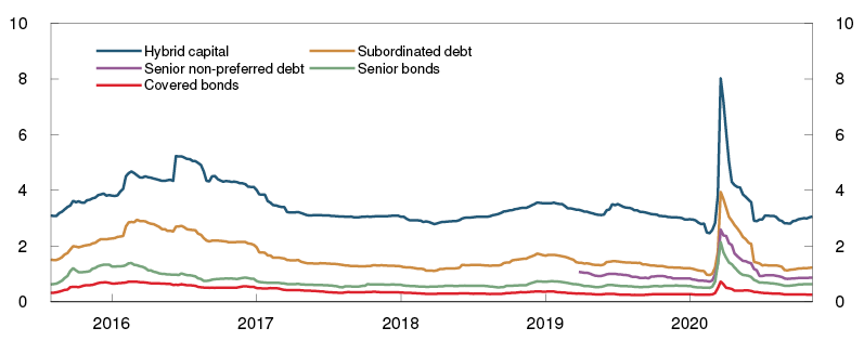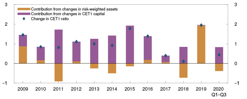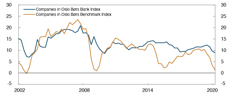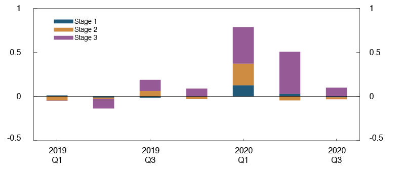 A forceful tightening of containment measures may lead to deeper downturn with a substantial reduction in the activity level, which in turn may increase banks’ losses markedly. The second sensitivity analysis estimates the effect of substantially higher-than-expected losses on loans and a significant loss on financial instruments. The losses assumed are based on an estimated relationship between financial imbalances and crisis depth.10 The level of financial imbalances is approximately unchanged since last year (see Monetary Policy Report 3/20), and the losses in the sensitivity analysis are therefore in line with the losses in last year’s stress test.11 This corresponds to annual credit losses as a share of gross lending of between 1.4% and 2.3%. The risk weights increase through the projection period. The value of the stock of equities is written down by 40% and fixed-income instruments by 5% in 2020. It is also assumed in the sensitivity analysis that the macro bank does not pay a dividend. Other assumptions are the same as in the analysis of expected developments.
