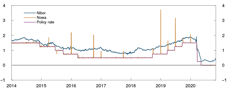 - Liquidity measures: Norges Bank has implemented a number of measures to improve market liquidity and ensure that the lower policy rate passes through to money market rates (see Section 2).