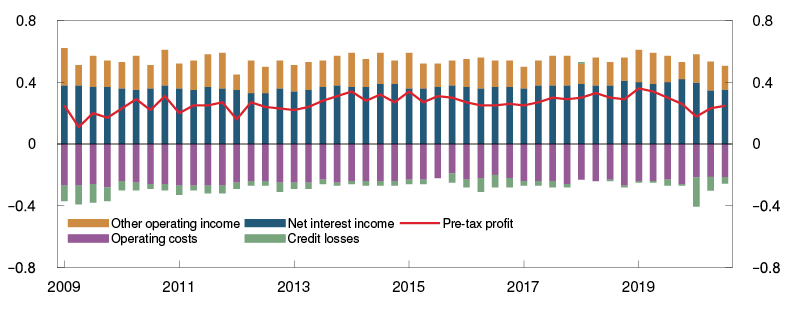 The spread between the macro bank’s lending rate and funding rate will narrow somewhat from the current level of around 1.7% further out in the projection period. The average residential mortgage rate is projected to edge down ahead (see Monetary Policy Report 3/20), and low interest rates are expected to continue to put downward pressure on banks’ deposit rates. Falling residential mortgage rates and pressure on deposit rates contribute to a lower interest margin.