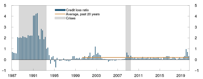 Losses on loans to households are expected to be moderate through the projection period (Chart 5.1). Higher unemployment weighs on household income and reduces debt servicing capacity. The reduction in debt servicing capacity will be dampened by the fact that many households affected by furloughs and layoffs receive relatively generous unemployment benefits. In addition, many households have liquid buffers to draw on, at the same time as low interest rates reduce interest burdens. Overall, households’ debt servicing capacity is assessed as stable through the projection period. Residential mortgages account for the bulk of loans to households. Expected house price developments in Monetary Policy Report 3/2020 indicate that banks generally have sufficient collateral in the event of default. This also contributes to dampening losses on loans to households.