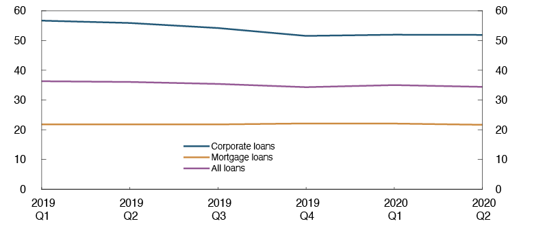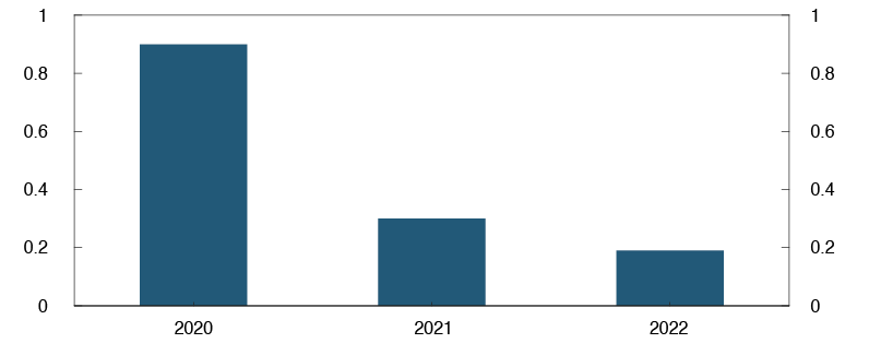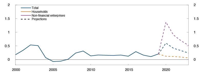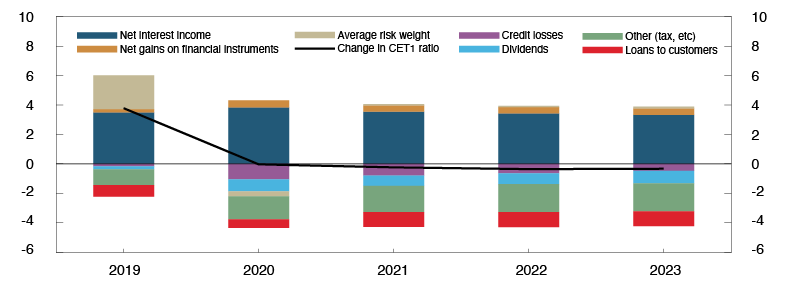 Dividend payouts have a substantial impact on banks’ loss-absorbing capacity. The Norwegian authorities have also discouraged paying out dividends until 1 January 2021, at the earliest.4 This is in line with the European Systemic Risk Board’s (ESRB) recommendation on the restriction of dividend distributions during the Covid-19 pandemic. This analysis is based on the assumption that banks that have not yet finalised the dividend policy for the financial year 2019 will not distribute dividends for that year. This implies that the macro bank’s dividend payout is about 10% of post-tax profits. This increases the Common Equity Tier 1 (CET1) capital ratio by 1.7 percentage points, compared with the level of capital adequacy that banks report. As a technical assumption, the dividend payout ratio is set at 50% in 2020.5 Thereafter, it also assumed that banks gradually increase dividend payouts to 60% of post-tax profits as the level of activity normalises further out in the projection period.