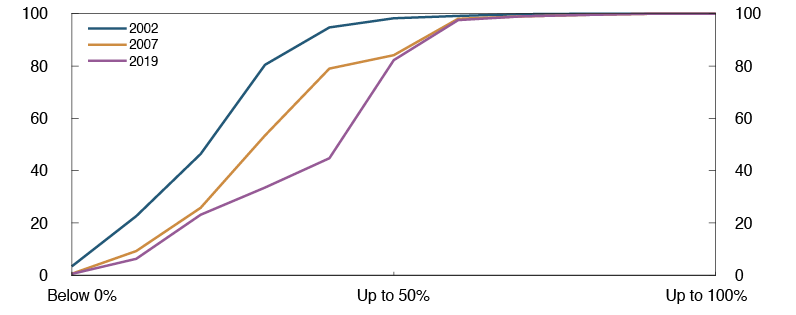 High debt increases household vulnerability to loss of income, higher lending rates and a fall in house prices. The risk that many households will tighten consumption at the same time represents a financial stability risk. Household leverage is at a high level. Debt growth has fallen somewhat since 2017, but has recently levelled off.