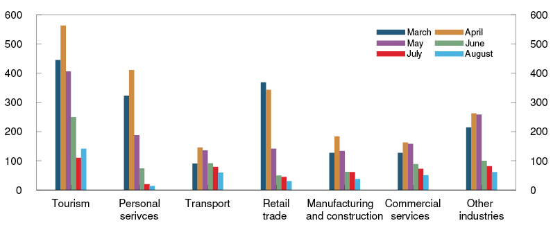 Activity in the Norwegian economy has fallen abruptly as a result of the Covid-19 pandemic, and the economy is now in the midst of a deep downturn. From 12 March, far-reaching measures were introduced to contain the spread of the virus. The containment measures have led to production halts and reduced activity across a range of businesses. The measures limited household demand. Many employees were furloughed or made redundant. Since then, activity in the Norwegian economy has picked up, and unemployment has fallen. At the end of August, the activity level in the mainland economy was still close to 4% lower than before the pandemic broke out in March. A significant increase in infection rates through autumn and stricter containment measures will likely put a break on the upswing in the coming period.