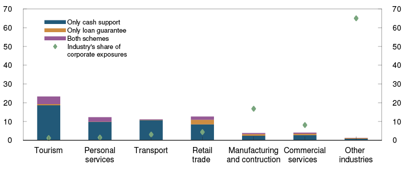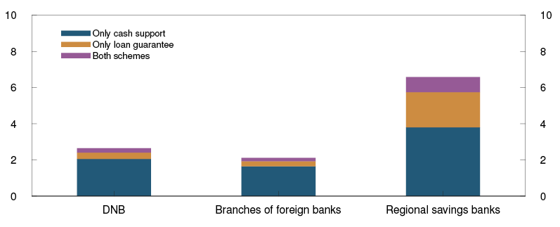 - Substantial fiscal policy measures have been implemented since mid-March. The stimulus packages include the loan guarantee scheme and the compensation scheme for businesses (see "How have government measures during the Covid-19 pandemic affected the risk of credit losses in the Norwegian banking sector?"). The measures also include increased allocations in other areas, temporary relaxation of furloughing rules and temporary changes in direct and indirect tax rates, rules and deadlines for submitting reports to government authorities. The purpose of these measures was to protect businesses and jobs (see the Government’s overview of measures1).