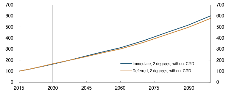 1 Period: 2015–2050. REMIND-MAgPIE is one of three models used for calculating NGFS climate scenarios. Different models will make somewhat different predictions. For more information, see NGFS (June 2020) «Guide to climate scenario analysis for central banks and supervisors».