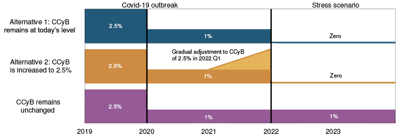 - The CCyB rate is kept at 1%, but is set at zero when the stress scenario arises. The buffer is kept at zero for the remainder of the analysis period, which extends to 2023. (Alternative 1)