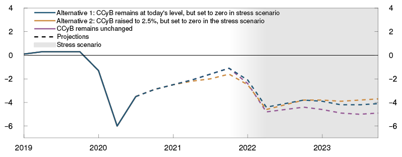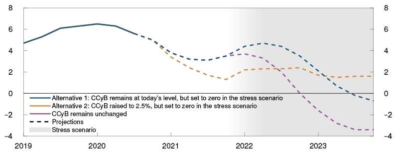 In the pre-stress scenario, we start with macroeconomic developments described in Monetary Policy Report 3/20. A higher CCyB in Alternative 2 will make banks more resilient to a situation with high loan losses and financial stress than in Alternative 1, where the buffer remain at today’s level (Chart 5.5) By ensuring that banks have more capital to draw on, a higher buffer rate may counteract a severe tightening of bank lending in the event of a downturn. Furthermore, higher capital ratios reduce the risk facing banks’ debt investors. This could help reduce banks’ financing costs in a situation with high losses. Lower financing costs will improve profitability and thus improve loss absorbency capacity.