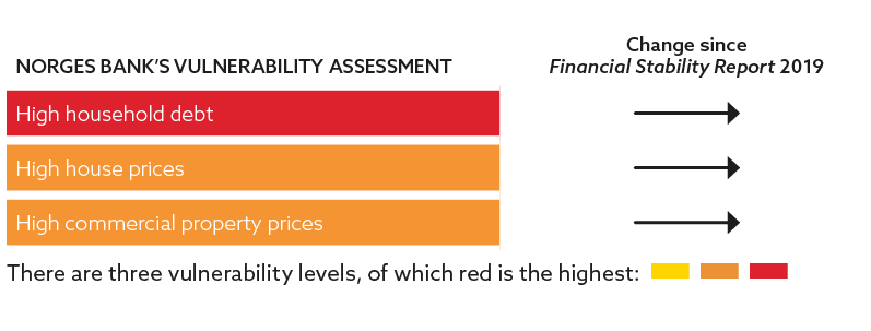 The key financial system vulnerabilities in Norway have long been high household debt, high house prices and high commercial property prices. These vulnerabilities are assessed as not substantially changed since Financial Stability Report 2019.