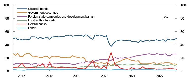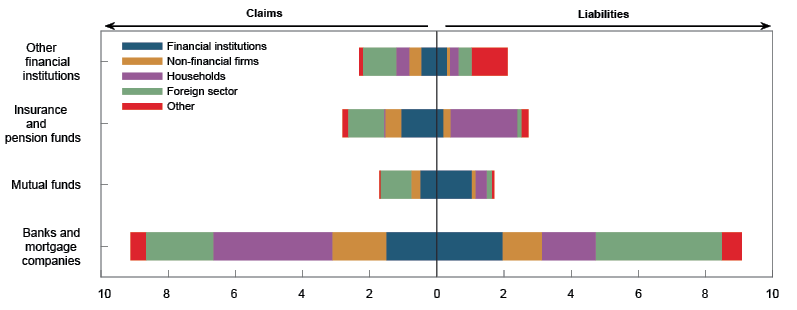 Covered bonds issued by other Norwegian banks account for a substantial portion of banks’ liquidity reserves. This implies that problems at one bank can more easily spread to other banks. If markets are stressed, sales of liquidity reserves to meet liquidity needs may result in greater spillovers than if banks did not have cross-holdings of covered bonds.