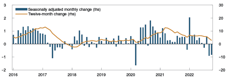 Debt growth and asset price inflation have often been high prior to financial crises and are indicators of cyclical vulnerabilities. Many securities prices have fallen so far in 2022 and, after having risen substantially through the pandemic, property prices have fallen this autumn. In Norges Bank’s overall assessment, cyclical vulnerabilities are approximately unchanged over the past year.