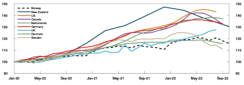 House prices have risen faster than household income over a long period. Prices have fallen this autumn, and the same tendency has been observed in other countries. The projections in the September 2022 Monetary Policy Report point to a moderate fall in house prices in Norway in 2023. Owing to uncertainty about macroeconomic developments and households’ response to higher interest rates, the forecast for house prices is more uncertain than normal. Sharp and sudden declines in house prices may trigger a tightening of household consumption and increase losses on banks’ loan portfolios.