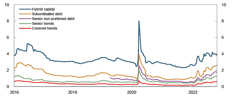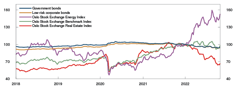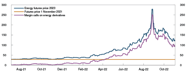 Price volatility has been high in a number of markets. Derivatives contracts often include collateral requirements (margin calls) to reduce counterparty risk. High price volatility has led to a considerable increase in margin calls in a number of markets. During the pandemic, increased margin calls led to periods of liquidity challenges for market participants with large derivatives positions, and in Norway the sharp depreciation of the krone led to liquidity stress for Norwegian asset managers who were forced to fire-sell securities. In 2022, a pronounced rise in energy prices has resulted in liquidity difficulties from time to time for Nordic power producers related to financial derivatives for hedging against energy price changes. High price volatility increased the risk of instability in the Nordic financial system, but government measures to strengthen the liquidity of market participants have improved market functioning. Higher energy prices have not posed any significant problems for Norwegian market participants (see “Challenges in the energy derivatives market”). This autumn, highly volatile UK government bond yields have led to increased margin calls and liquidity problems for a number of UK pension funds (see “Asset managers' behaviour can amplify negative price movements”).