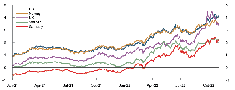 In the years after the financial crisis, global inflation was low in an environment of historically low interest rates in most countries, which contributed to high risk-taking and elevated asset and property prices. Pandemic-related supply and demand conditions and the war in Ukraine have led to a surge in inflation among Norway’s main trading partners since autumn 2021. Reduced Russian gas exports have pushed up energy prices. Energy transitions, such as the phasing out of nuclear power in some countries, have also pushed up energy prices. Faced with higher inflation, central banks have raised policy rates substantially over the past year, and market policy rate expectations indicate further increases in the coming year, both in Europe and the US. Long-term interest rates have also risen considerably over the past year (Chart 1.1).