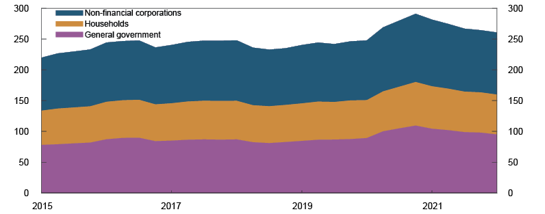 Owing to vulnerabilities in the Norwegian financial system, a downturn or market stress may have more serious consequences for financial stability. Vulnerabilities are broadly at the same level as at the time of Financial Stability Report 2021, but an increased risk of a downturn implies a greater risk that vulnerabilities materialise. Many households are highly indebted and the vast majority have floating-rate loans. Household leverage is close to a historically high level, and it is high compared with other countries. Higher interest rates and living costs imply tighter finances for many, but the Bank’s analyses show that most households are able to service their debt. High indebtedness makes households vulnerable to loss of income, higher interest rates or a fall in house prices. If many households reduce consumption sharply, firms’ earnings are impaired and banks may face higher losses on corporate exposures. This constitutes a risk to the financial system. A sharp fall in house prices may also lead to substantial bank losses on non-performing residential mortgages of households with a high debt-to-value ratio.