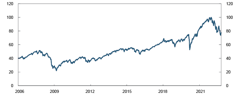 Chart 1.3 International stock indices have fallen considerably this year3 MSCI global stock market index. Week 1 2022 = 100