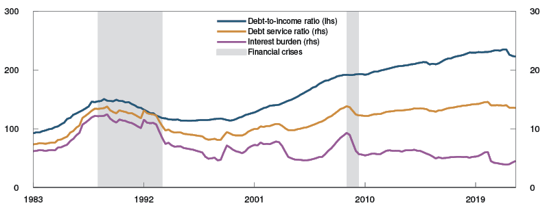 Households’ interest burden, ie the ratio of income to interest payments, fell to a historically low level during the pandemic. More than 90% of households have floating-rate loans, and the interest burden will rise ahead in pace with higher lending rates. Household debt service ratios, which also include estimated principal payments, are expected to rise owing to higher interest rates and a high level of household debt. In Norges Bank’s Survey of Bank Lending 3/2022, banks report slightly lower household credit demand in 2022 Q3, and several banks reported an increase in demand for interest-only loans. Lending standards were overall unchanged in 2022 Q3, and the banks expect a slight tightening of lending conditions in 2022 Q4. Over the next few years, with debt growth expected to be somewhat lower than income growth, household leverage will decline (see Monetary Policy Report 3/22 and Chart 3.1 in the stress test in Section 3). This may, over the longer run, help reduce the vulnerabilities associated with high household debt. However, there is considerable uncertainty surrounding economic developments ahead.
