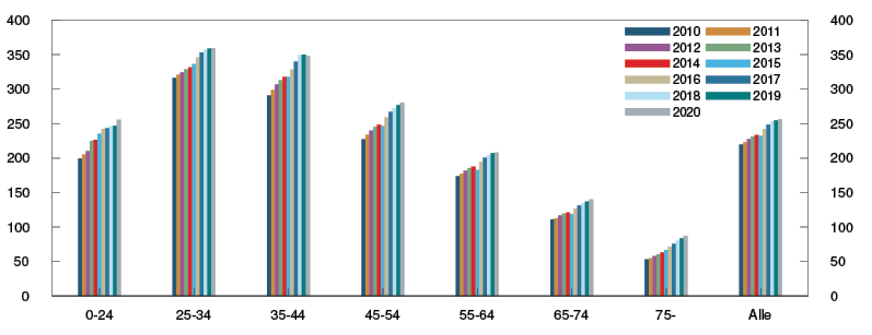 The high debt of many households is the main structural vulnerability in the Norwegian financial system. Household leverage is close to a historically high level (Chart 1.4) and is high compared with other countries. High income growth, especially in the form of increased equity dividends5, contributed to the decline in household leverage towards the end of 2021. High household debt in Norway largely reflects elevated house prices and a large proportion of home ownership. In addition, residential mortgage rates have been very low over several years, which has pushed up debt levels and house prices. Household debt is unevenly distributed, and household leverage is particularly high among younger age groups, as many first-time home buyers and households trade up in the housing market (Chart 1.5). During the period between 2010 and 2020, household leverage increased across all age groups. Data from Finanstilsynet’s (Financial Supervisory Authority of Norway) residential mortgage lending survey for 2022 shows that almost half of all new loan amounts have been granted to borrowers with debt over four times annual income. This share was unchanged from 2021 and slightly higher than in 2020.