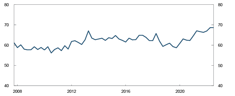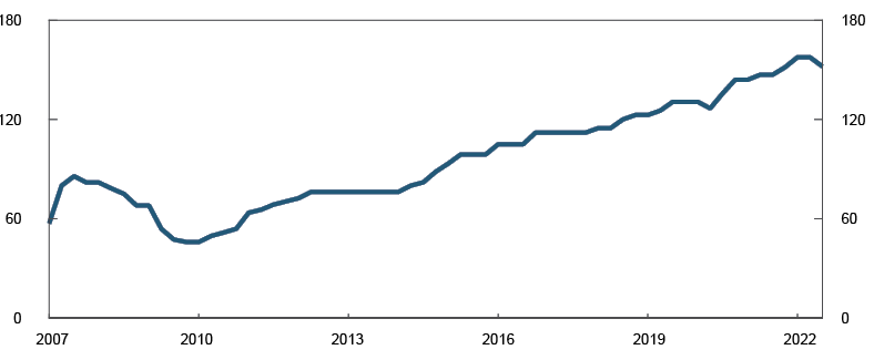 In 2022 Q3, the yield rose sharply, and rents increased markedly according to Norges Bank’s price statistics. Overall, selling prices fell somewhat. Because recent transactions have been at a low ebb, there is considerable uncertainty surrounding actual market prices. Over the past half year, real estate portfolio writedowns of major market participants and surveys11 of property investors show that the yield in most CRE segments have risen recently in Norwegian cities.