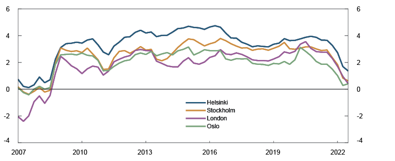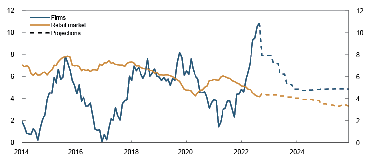 There is a high degree of uncertainty surrounding the outlook for global growth and inflation ahead. The war in Ukraine is impacting both the European and global economy and adding to the uncertainty. For the Norwegian economy, the European market is particularly important. A sharp reduction of Russia’s gas exports to Europe and the risk of energy rationing heightens the risk of a pronounced downturn in the euro area and the UK. In the US, inflation has been high over the past year. In China, pandemic-related restrictions and lower activity in the real estate sector have contributed to weaker growth. If inflation picks up further in advanced economies and monetary policy becomes more contractionary than expected, global economic growth may weaken further and result in further volatility in international financial markets.
