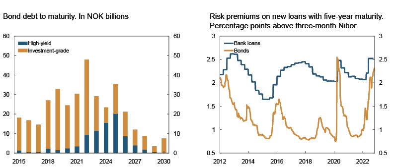 Over the past year, CRE firms’ financing costs have increased owing to the higher interest rates and credit premiums. The debt-to-revenue ratios of CRE firms is higher than that of other firms and their profitability is more vulnerable to higher interest expenses compared with firms in other sectors. Bank debt accounts for the largest share of CRE firms’ debt, but bond debt is an increasingly important source of financing. Bond market and bank lending premiums have increased substantially (Chart 1.8). A majority of the banks in Norges Bank’s lending survey in October report that, owing to developments over the past year, they require stricter debt-servicing capacity and equity ratio requirements for new CRE loans. A large amount of bond debt issued by CRE firms will mature in the years ahead. A marked fall in commercial property prices may lead to some CRE firms finding it difficult to issue new bonds at the same time as obtaining bank loans may be more challenging.