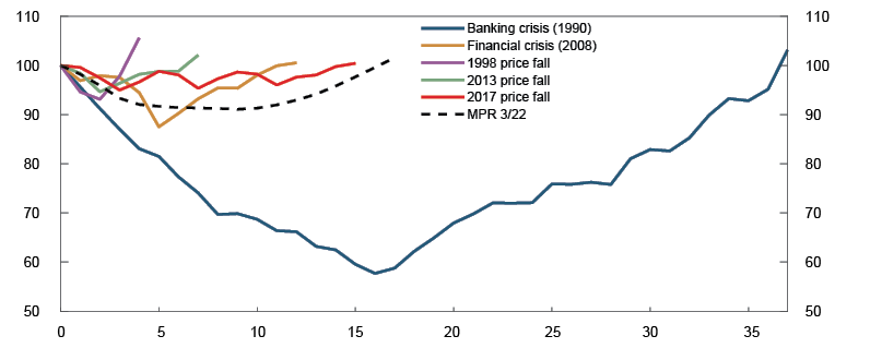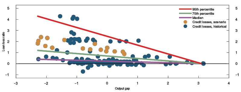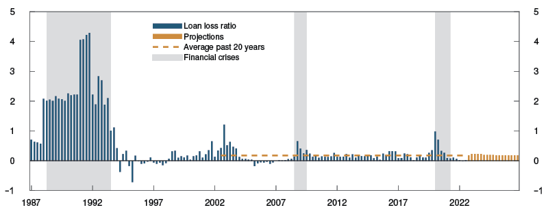 Low yields increase the risk of a sharp fall in commercial property prices. New periods of substantial market volatility may lead to a higher risk premium and higher yields than previously assumed. Higher long-term interest rates will also pull up the yield. In the event of a more pronounced slowdown than currently envisaged, developments in rents may be weak. A sudden increase in the yield and a fall in rents will entail a sharp fall in selling prices. If commercial property prices fall in line with the projections, banks’ CRE loan losses are expected to remain low. However, in a downturn where commercial property prices fall sharply, banks’ CRE loan losses may be substantial (see the stress test in Section 3).