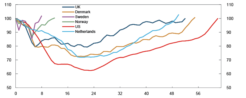 The yield depends on developments in long-term interest rates and risk premiums. The spread between the yield and the five-year swap rate, which is a simple measure of the risk premium, is at a low level (Chart 1.7). This applies both in Oslo and other European cities. In the years ahead, a gradual rise in the yield for Oslo and a moderate rise in rents are expected. Overall, the projections for rents and the yield indicate that selling prices will fall in the years ahead (see Monetary Policy Report 3/22).