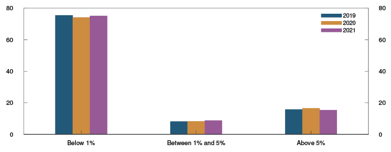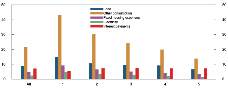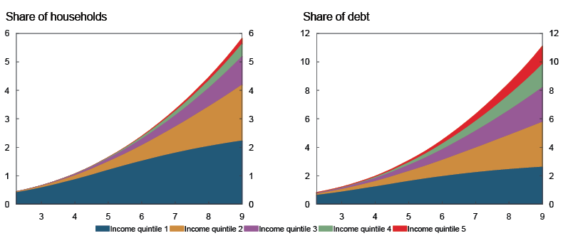 High debt makes households vulnerable to income loss, higher interest rates or a decline in house prices. In addition to increased interest expenses, households are facing higher expenses related to, for example, food and electricity. However, a sensitivity analysis shows that most households are able to service their debt. Only between 2% and 3% of homeowner debt is held by households who may have difficulties covering normal expenses and expected higher interest rates with disposable income and assets, compared with about 1% at 2020 price- and interest rate level (see “Households are resilient to moderate increases in interest rates and other expenses”). Low-income households account for a large share of households with payment problems, but a larger share will have to tighten consumption, which may amplify an economic slowdown.8 Analyses9 also show that much of the highly vulnerable consumer debt is held by low-income and non-homeowners. At the same time, this accounts for a small share of total debt. Bank losses are expected to remain low ahead (see Section 2), but losses on loans to customers with weak debt-servicing capacity will likely edge up.