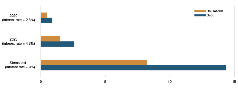 Considerable uncertainty about the macroeconomic outlook ahead entails heightened risk of new negative events, and highly indebted households may be particularly vulnerable. A sensitivity analysis (see “Households are resilient to moderate increases in interest rates and other expenses”) shows that in a scenario with, for example, high interest rates and a sharp fall in house prices, many households may have difficulties covering normal expenses and interest. Banks’ losses may then rise owing to households defaulting on their debt. The analysis illustrates that many households in such a situation may have to reduce consumption to a relatively moderate level. This may pose a threat to financial stability because a tightening of consumption may reduce firms’ earnings and thus their debt-servicing capacity. The stress test in Section 3 illustrates this scenario.