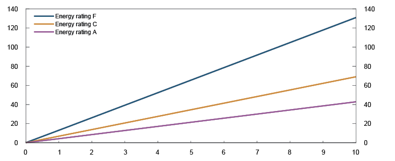 The climate transition may result in structural changes in the CRE market. Norges Bank’s analyses show that the usage costs of buildings with low energy-efficiency may increase considerably in the event of high electricity prices over time, which in turn could weaken the rents of such buildings (see “Growing importance of energy-efficient buildings in the years ahead”). The effect on rents in such a situation is very uncertain, and the impact on rents can be mitigated by energy efficiency measures. The analysis also shows that less than 25% of commercial buildings in Norway have a registered energy label, and among these fewer than half have a high energy label rating. Office buildings have the highest share of buildings with an energy label rating, and bank exposure to this segment is particularly high. Norway does not yet have a system in place to classify Norwegian buildings according to the EU green taxonomy, which will enter into force in Norwegian law in 2023. Inadequate reporting according to the taxonomy can have consequences for the ability of Norwegian banks to issue “green loans”, and thus the possibility to raise “green funding” with lower credit premiums.