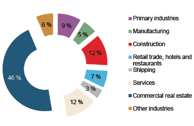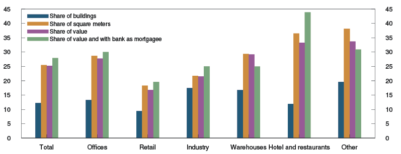 The CRE market is heterogenous, where office buildings are by far the largest segment. An analysis14 by Norges Bank indicates that banks are broadly exposed to various categories of commercial property. Office premises in the largest cities account for the largest share of commercial property value in Norway, and banks have considerable exposures to this segment (Chart 1.9). Banks also have large exposures to retail and industrial buildings and exposure to warehouse/logistics properties is also substantial, while banks are markedly less exposed to hotels and restaurants. Banks’ diversification across various segments in isolation reduces the risk of losses on banks’ CRE exposures.