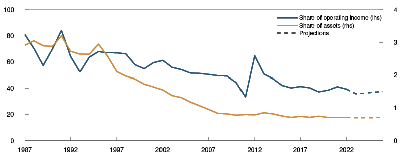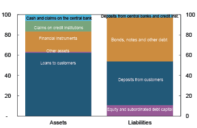Banks’ exposures to commercial real estate (CRE) are substantial, and in autumn, property prices have edged down. An economic downturn with a fall in selling prices and rental income may have a substantial impact on this sector and result in large bank losses. Owing to low yields on commercial property, selling prices are vulnerable to higher interest rates and lower risk appetite.