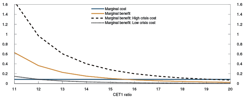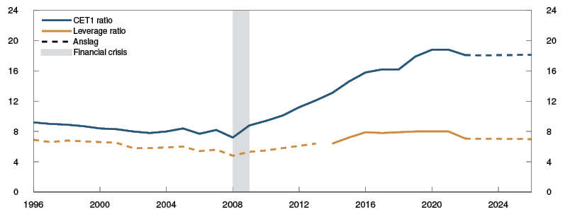 Increased bank capital promotes financial stability because it reduces the risk that banks contribute to amplifying a downturn. Sharp economic downturns may result in such large credit losses that banks dip into their capital buffers. Stress tests and sensitivity analyses show that Norwegian banks’ current capital levels are high enough for them to cope with scenarios where losses are considerable. Capital levels are also in line with what analyses show to be the level of capital banks should hold in the long term. Bank capital levels that are too low are more economically costly than if bank capital should prove to be too high.