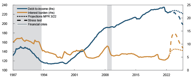 Chart 1.4 Household leverage is high and interest burden is increasing6 Percent