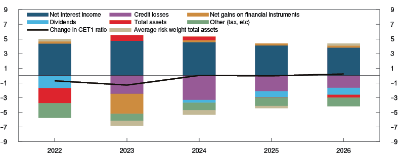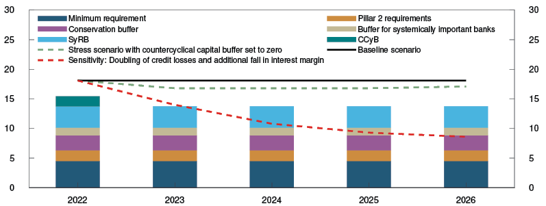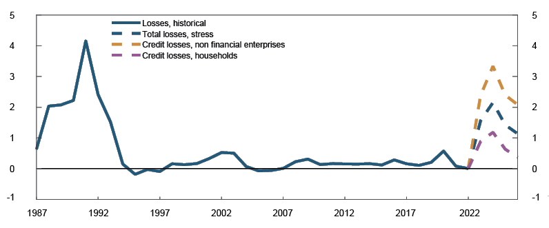 The stress test in this Report shows that the largest Norwegian banks as a whole are capable of absorbing losses in the face of a sharp downturn in an environment where inflation is significantly higher than it is today. In the stress scenario, high living costs and interest rates hit households hard, and banks incur losses. On the other hand, some firms will benefit from high commodity and energy prices. This cushions losses on commercial loans somewhat, but banks still incur significant losses owing to a sharp fall in property prices and belt-tightening by a large number of households. The stress test shows some of the many possible adverse events that the financial system may face and outlines a possible outcome of how the financial system copes with a sharp, but not inconceivable, downturn. The current situation makes it especially important for the financial system to maintain a high level of resilience, so that it can perform its tasks effectively even in the event of severe downturns and economic crises.