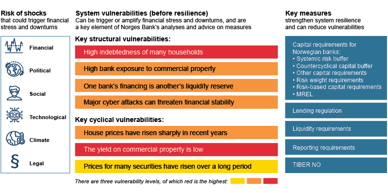 Since the financial crisis in 2008, the Norwegian authorities have introduced a number of rules to mitigate vulnerabilities and increase financial system resilience (see diagram). For more detailed information about these measures, see “Important measures in the financial system in Norway”. The measures primarily help to increase financial system resilience but can also mitigate vulnerabilities. High profitability, sound capital adequacy and sound risk management by financial institutions also strengthen resilience.