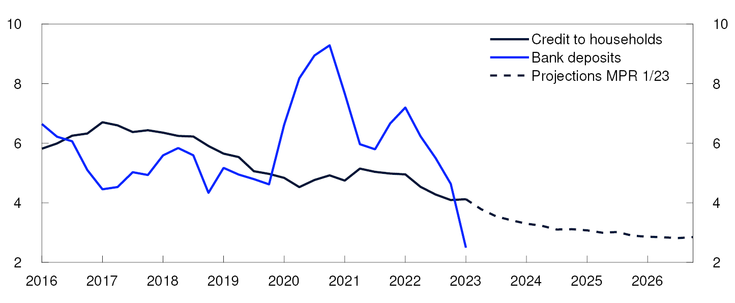 Given higher lending rates, households will have to spend a larger share of income on interest payments (Chart 2.3). Given the policy rate forecast in Monetary Policy Report 1/23, household interest burdens are set to increase from close to 7% in 2022 Q4 to just over 9% in the course of 2023. Interest burdens in 2020 Q4 were at around 4%. Household debt service ratios, which include both interest and ordinary principal payments, are expected to rise to a historically high level.