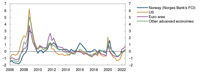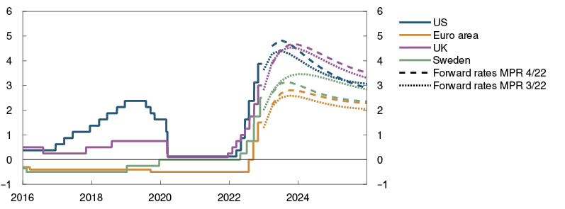 Since the September Report, central banks abroad have continued to tighten monetary policy, primarily in response to high inflation. Central banks in the US, euro area, UK and Sweden have all raised their policy rates, which are now at their highest levels since the financial crisis. The market’s policy rate expectations for the coming period have risen slightly since the September Report. At the same time, forward rates indicate expectations of a slower pace of increase in policy rates in the coming year, which also reflects what most central banks have signalled.