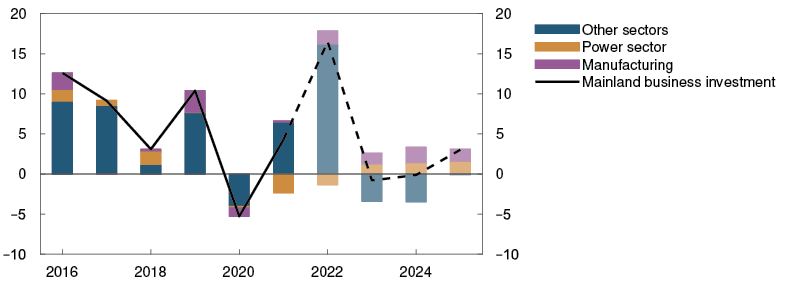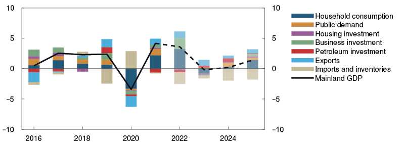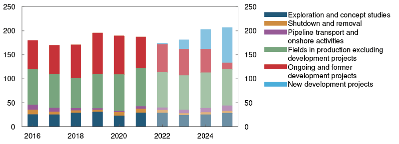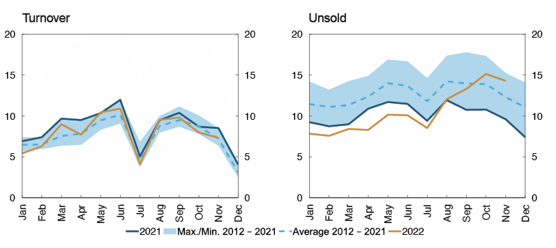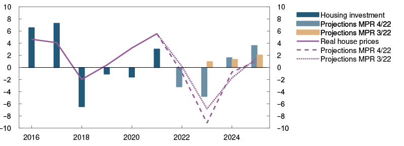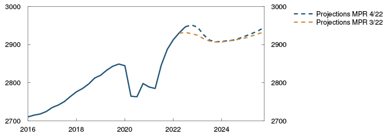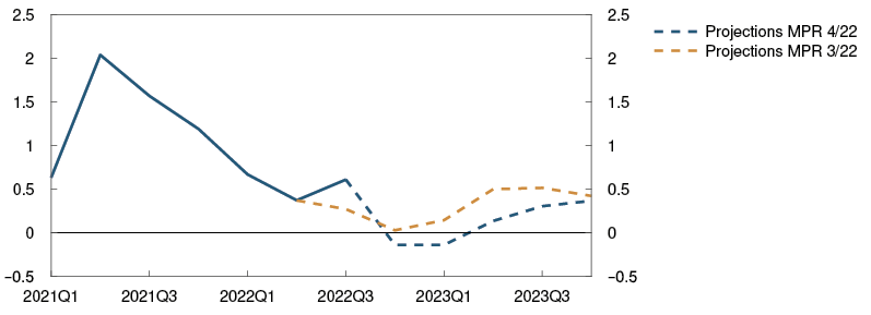 Activity in the Norwegian economy is projected to fall in the near term. Higher inflation and a weaker housing market are expected to contribute to a more rapid cooling of the Norwegian economy than envisaged in September. Substantial investments in the petroleum industry and activities related to climate transition are expected to lift activity somewhat further ahead.