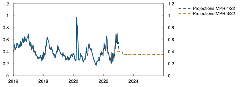 Consumer price inflation is very high in many countries. European gas and electricity prices remain at high levels, but futures prices for the coming year are lower than in September. The high level of inflation is reducing household purchasing power. Trading partner GDP growth is expected to be low in 2023. The projection has been revised down since the September 2022 Monetary Policy Report. The high degree of financial market volatility has persisted since September. Market forward rates indicate that policy rate expectations for the period ahead are slightly higher than in September and that central banks will gradually slow the pace of monetary policy tightening.
