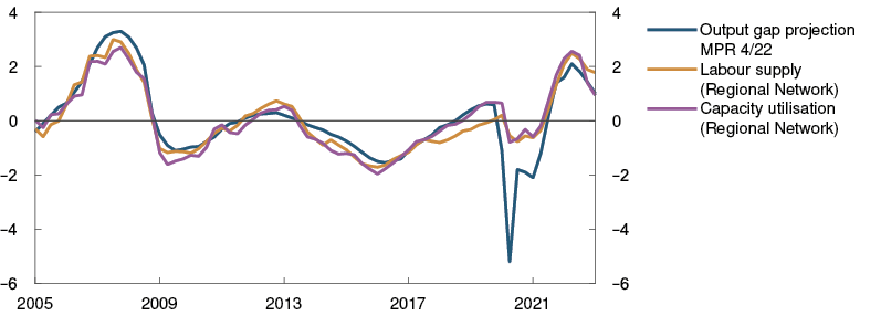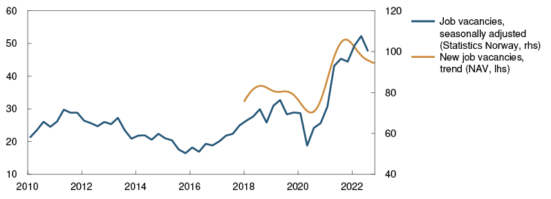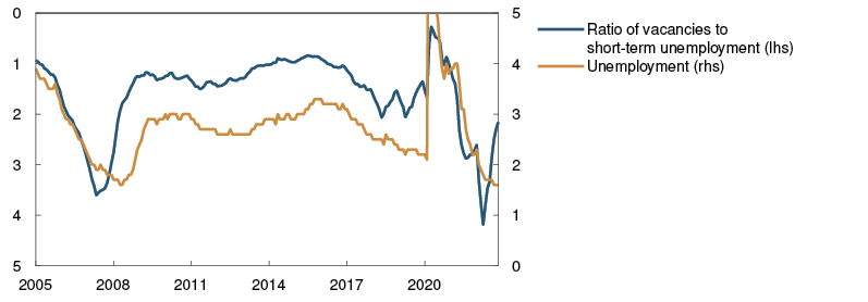 The labour market is tight. Employment has continued to rise, and unemployment has remained very low. Seasonally adjusted registered unemployment was 1.6% in November, which was slightly lower than projected in the September Report. There are still considerable labour shortages, but shortages are easing. The share of enterprises in Norges Bank’s Regional Network reporting that labour shortages are limiting output fell further in November. The number of job vacancies has also decreased.