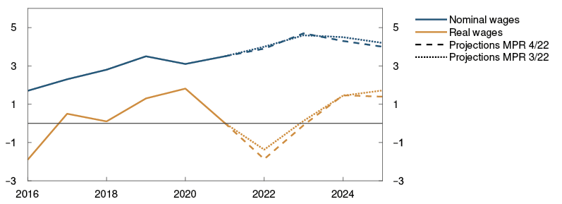 Wage growth is set to be higher in 2022 than in 2021, partly reflecting labour market tightness. Register-based wage statistics indicate that wage growth in the first three quarters of 2022 may have been slightly lower than projected. The projection for wage growth in 2022 has been revised down to 3.9%, implying a sharp decline in real wages. Norges Bank’s Expectations Survey indicates that wage growth expectations for 2023 have increased since September and nominal wage growth is expected to show a marked increase in 2023.